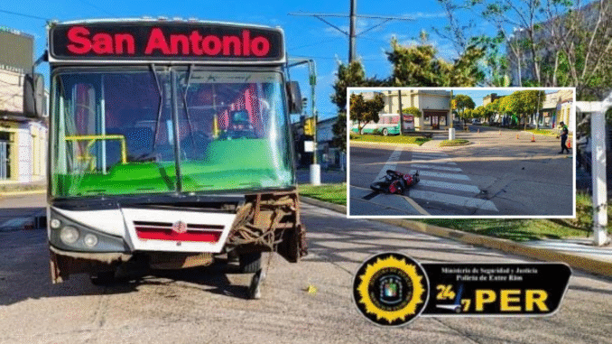 CRIA N° 1 CHAJARI: En horas de la mañana de este sábado, alrededor de las 06:15, se registró un siniestro vial en la intersección de Av. Belgrano y Sarmiento, donde un colectivo que trasladaba trabajadores impactó con una motocicleta.