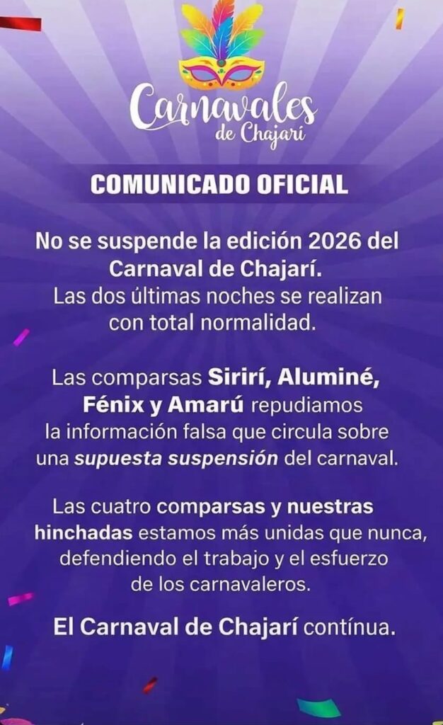 El mencionado comunicado que integrantes de la Comisión Organizadora le hicieron llegar a nuestro medio, confirmaron que “el rumor de suspensión surgió en redes sociales, nunca se analizó esa posibilidad. No sabemos por qué hay gente queriendo hacer daño con tantas mentiras”.