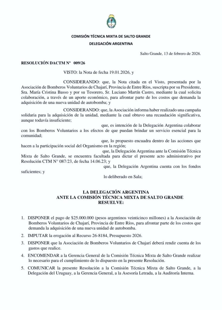 En primer lugar, en el día de la fecha tenemos el agrado de comunicar que se ha hecho efectivo el aporte de CTM, otorgado bajo la Resolución DACTM Nº 009/26. Informaron de Bomberos de Chajarí.