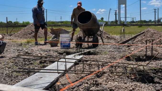 La obra se erige en el sector de ingreso del Área Industrial de Chajarí. Esta etapa de la construcción del Salón de Usos Múltiples se ejecuta con materiales y contratación de la mano de obra realizada mediante concurso de precios. Los trabajos consistieron primero en la nivelación y replanteo del terreno, desmonte y retiro de capa vegetal de tierra. Ahora se avanza en la fundación manual de la estructura edilicia, mediante excavación, colocación de zapata, muros y vigas. Luego se realizará el colocado de columnas vigas y de la losa.