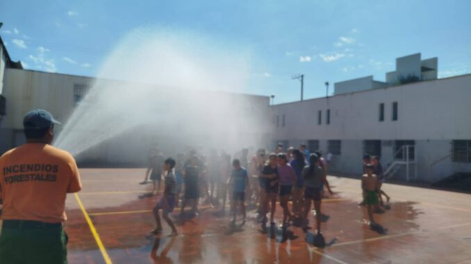 En el sexto día de la Colonia de Vacaciones, los profes y los chicos disfrutaron de divertidos juegos con agua, que fueron posibles gracias a la autobomba de los Bomberos Voluntarios de Villa del Rosario.