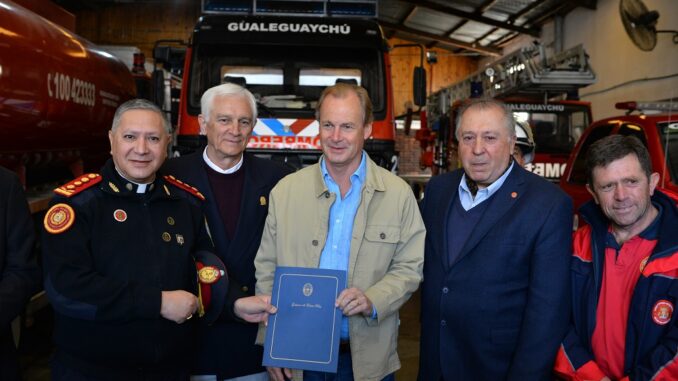 El mandatario, estuvo este viernes en Gualeguaychú donde fue recibido por el intendente, Martín Piaggio, y el secretario de Desarrollo Social, Martín Roberto Piaggio. Visitó el cuartel de Bomberos Voluntarios, y entregó a las autoridades de la Federación Entrerriana el decreto de promulgación de la Ley Nº 11.116, que entre otros beneficios otorga un servicio de salud y un haber jubilatorio a los bomberos voluntarios de la provincia.