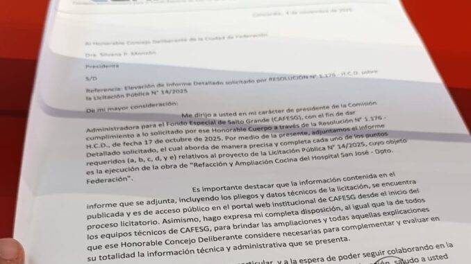La Comisión Administradora para el Fondo Especial de Salto Grande (CAFESG) informó hoy la presentación formal de la documentación e información solicitada por el Honorable Concejo Deliberante (HCD) de Federación, a través de un pedido de informe contenido en la Resolución N° 1.176 – H.C.D., de fecha 17 de octubre de 2025.