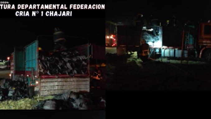 Según pudo saber NoticasChajarí.Ar que el conductor del rodado notó que la carga se estaba incendiando, motivo que lo llevó a retomar hacia el arco de acceso a la ciudad de Chajarí, deteniéndose en el Km. 328.