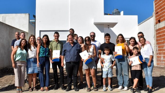 La entrega de viviendas contó con la presencia de la Secretaria de Gobierno y Hacienda Elisa Moix, el Encargado del Área de Vivienda Facundo Saavedra, la Vice Intendente Fabiola Fochesatto Brunini, la Diputada Gabriela Lena, acompañando a los beneficiarios y sus familias en este grato acontecimiento.