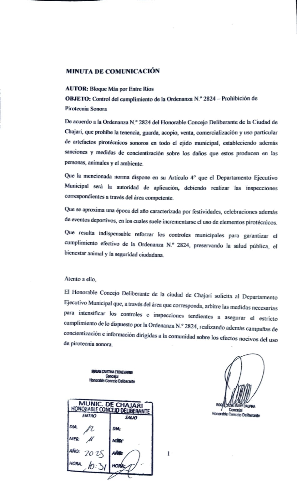 El Honorable Concejo Deliberante de la ciudad de Chajarí solicita al Departamento Ejecutivo Municipal que, a través del área que corresponda, arbitre las medidas necesarias para intensificar los controles e inspecciones tendientes a asegurar el estricto cumplimiento de lo dispuesto por la Ordenanza N.º 2824, realizando además campañas de concientización e información dirigidas a la comunidad sobre los efectos nocivos del uso de pirotecnia sonora.