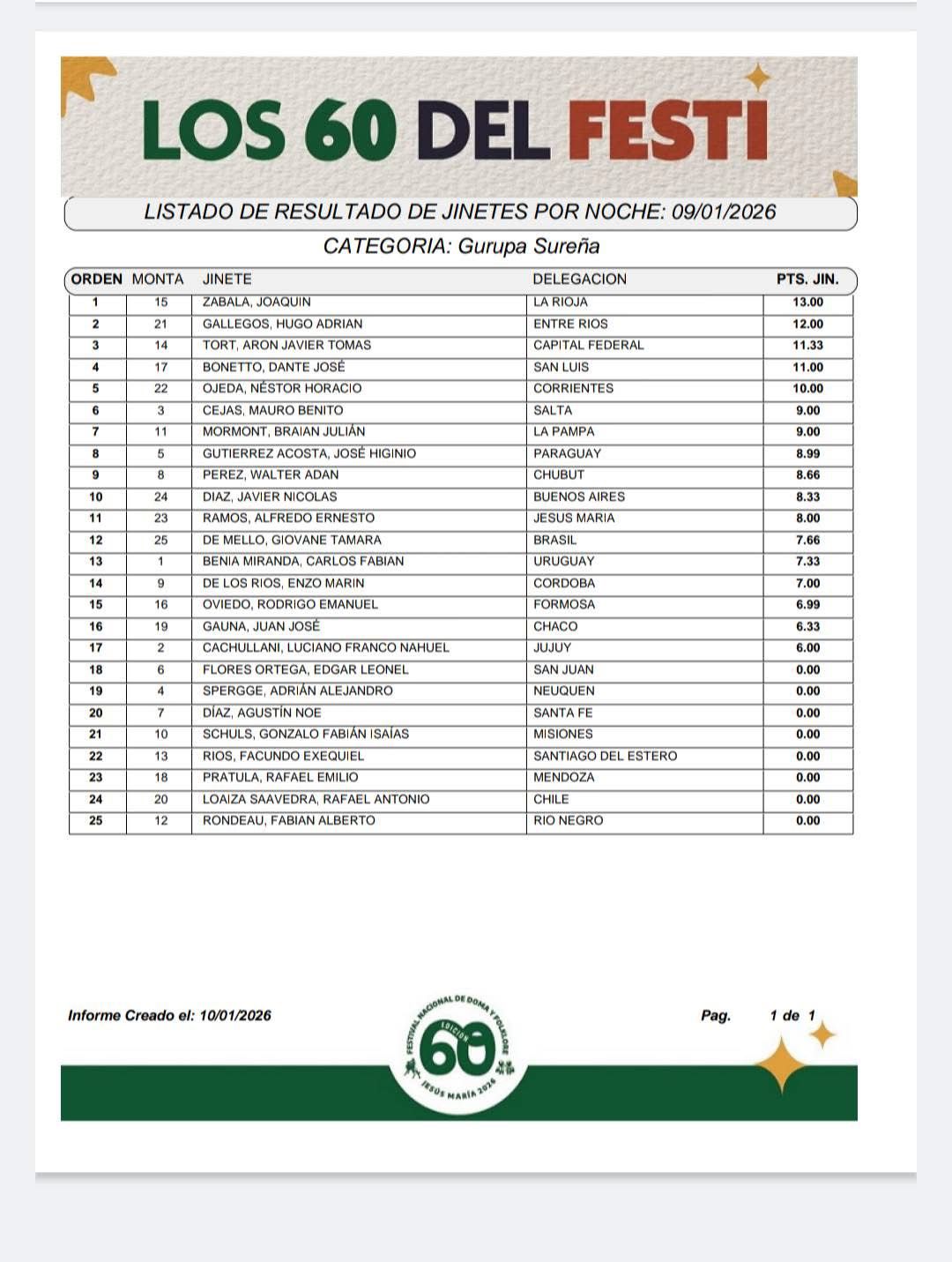 Con apenas 19 años y en su debut absoluto en el anfiteatro José Hernández, Gallegos ha demostrado que la presión del «escenario mayor» no le pesa. El representante de la delegación de Entre Ríos tuvo un inicio arrollador en la categoría Gurupa Sureña, posicionándose rápidamente en los puestos de vanguardia de la tabla general.
