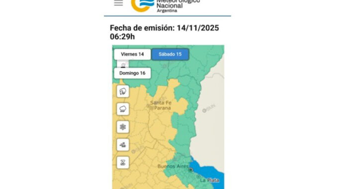 El área de Defensa Civil de la provincia informó que el Servicio Meteorológico Nacional emitió una alerta amarilla para el oeste del territorio provincial, por lluvias y tormentas para este sábado por la noche. La zona abarca los departamentos Gualeguay, Victoria, Villaguay, Nogoyá, Diamante, Paraná y La Paz.