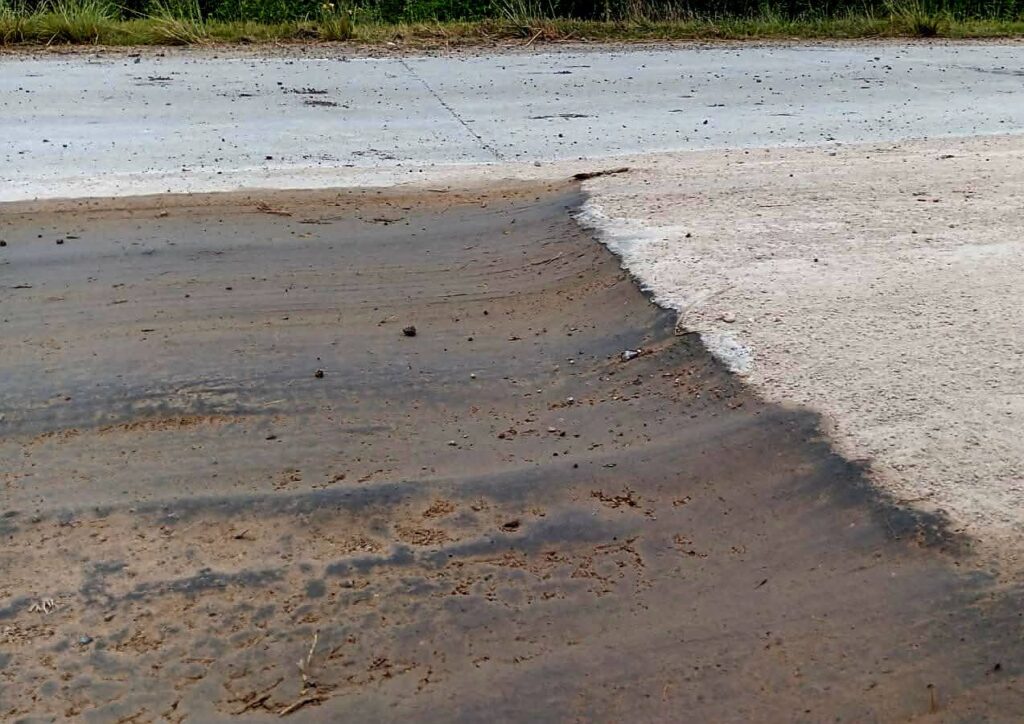 En las primeras horas de este lunes 22 de diciembre, una familia oriunda de Santa Cruz, sufrieron rotura de dos llantas transitando por ruta nacional 127 la cual fue «reparada» con mezclas asfáltica (tierra) y por las consecuencias de las últimas lluvias comenzó a hundirse dejando el filo de las lajas de cemento a la vista convirtiendo la ruta en una trampa.