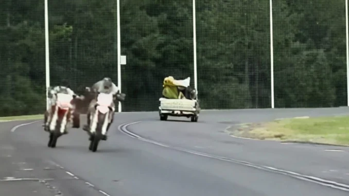 Las imágenes muestran a un grupo de motociclistas transitando a alta velocidad y compitiendo entre ellos en la ruta 015, camino al lago de Salto Grande. Un panorama que en otras épocas se veía comúnmente en la zona del Liquidámbar o en caminos alternativos a la Costanera de la ciudad.