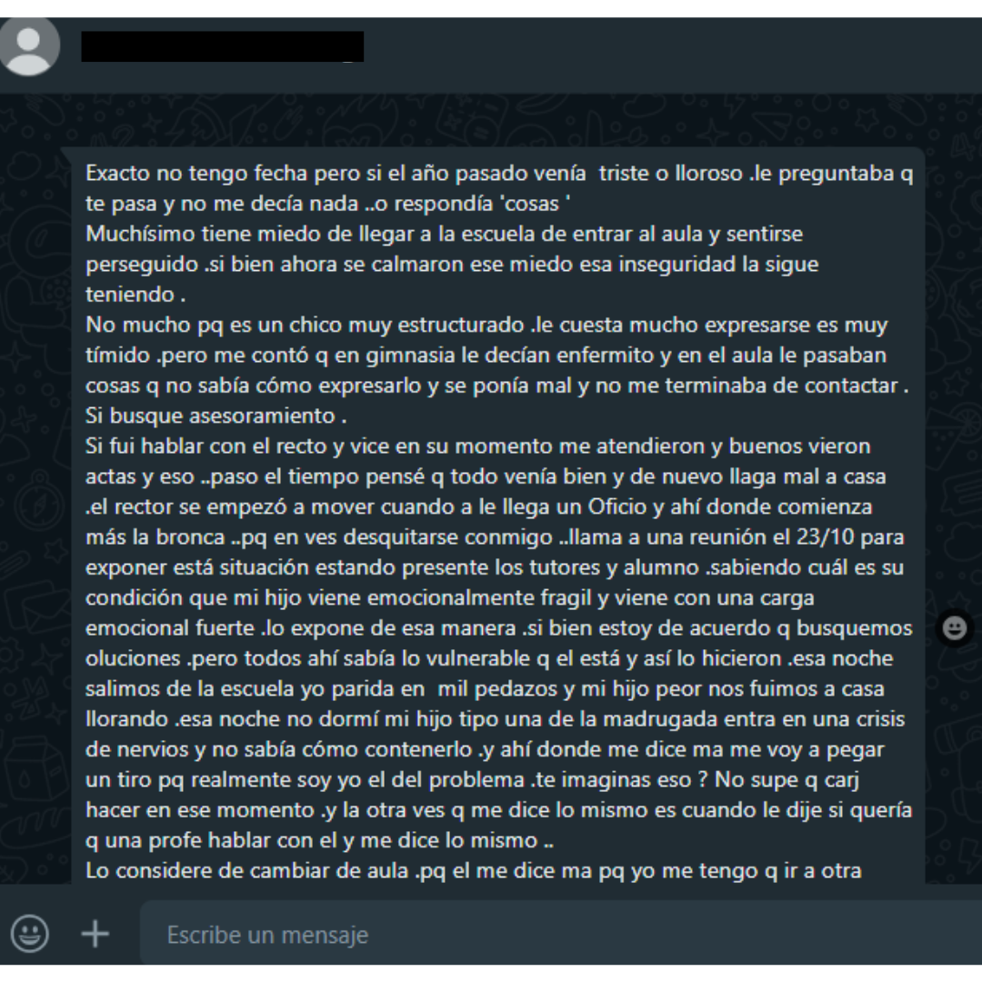 En una entrevista realizada por noticiaschajari.ar a la madre del adolescente, la mujer ha compartido el calvario que su hijo ha estado enfrentando en la escuela debido al acoso escolar. Aunque no puede precisar una fecha exacta, la madre revela que el año pasado su hijo comenzó a llegar a casa triste y lloroso, pero cuando le preguntaba qué le pasaba, él simplemente respondía «cosas».
