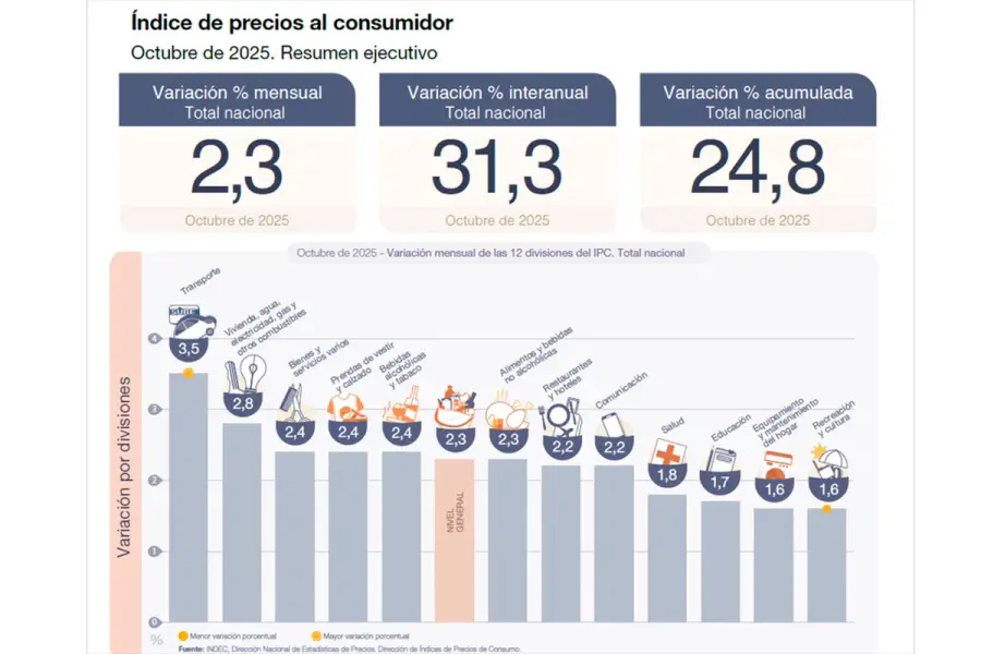 Luego del 2,1% de septiembre, la inflación presentó una leve aceleración/desaceleración en octubre, al alcanzar el 2,3%, según el Instituto Nacional de Estadística y Censos (Indec). Con este dato, la variación para los últimos doce meses fue de 31,3% y acumuló 24,8% en lo que va del 2025.