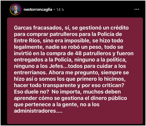 El ministro de Seguridad de Entre Ríos, Néstor Roncaglia, utilizó sus redes sociales para responder de manera contundente a declaraciones que habían cuestionado la adquisición de patrulleros mediante un crédito gestionado por la provincia.