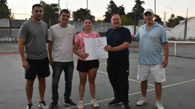La entrega tuvo lugar en la cancha de tenis del club, de la mano del Intendente Marcelo Borghesan y del Director de Deportes y Recreación, Ramiro Galeano. Dara, por su parte, estuvo acompañada por su profe y por el Presidente de la entidad, Luis Brarda.