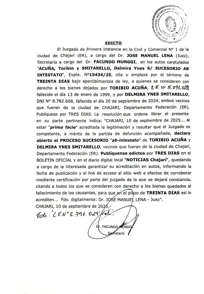 El Juzgado de Primera Instancia en lo Civil y Comercial N° 1 de la ciudad de Chajarí (ER), a cargo del Dr. JOSE MANUEL LENA (Juez), Secretaría a cargo del Dr. FACUNDO MUNGGI, en los autos caratulados «ACUÑA, Toribio y SMITARELLO, Delmira Ynes S/ SUCESORIO ABINTESTATO», Expte. N°15434/25, cita y emplaza por el término de TREINTA DIAS bajo apercibimientos de ley, a quienes se consideren con derecho a los bienes dejados por TORIBIO ACUÑA, LE N° 5.791.029, fallecido el día 13 de enero de 1999, y por DELMIRA YNES SMITARELLO,DNI N° 8.782.608, fallecida el día 20 de septiembre de 2024, ambos vecinos que fueran de la ciudad de CHAJARI, Departamento Federación (ER). Publíquese por TRES DIAS. La resolución que ordena librar el presente en su parte pertinente indica: «CHAJARI, 10 de septiembre de 2025… Al estar «prima facie» acreditada la legitimación y resultar que el Juzgado es competente, a mérito de la partida de defunción acompañada, declaro abierto el PROCESO SUCESORIO «ab-intestato» de TORIBIO ACUÑA Y DELMIRA YNES SMITARELLO, vecinos que fueran de la ciudad de Chajarí, Departamento Federación (ER). Publíquense edictos por TRES DIAS en el BOLETIN OFICIAL y en el diario digital local «NOTICIAS Chajarí», quedando a cargo de la interesada garantizar su acreditación en autos, informando la fecha de publicación y el link de acceso al sitio web a efectos de corroborar mediante certificación por parte del juzgado de la que se dejará constancia, citando a todos los que se consideren con derecho a los bienes quedados al fallecimiento de los causantes, para que en el plazo de TREINTA DIAS así lo acrediten… Fdo. digitalmente: Dr. JOSE MANUEL LENA – Juez».