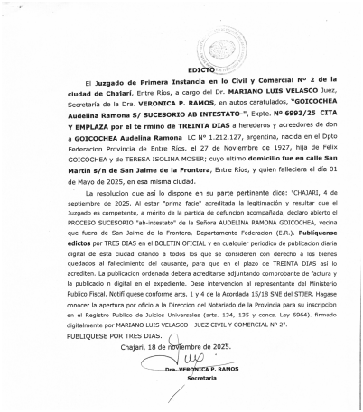 El Juzgado de Primera Instancia en lo Civil y Comercial Nº 2 de la ciudad de Chajarí, Entre Ríos, a cargo del Dr. Mariano Luis Velasco, Juez, Secretaría de la Dra. Verónica P. Ramos, en autos caratulados: “GOICOCHEA, Aurelia Ramona S/ SUCESORIO AB INTESTATO” – Expte. Nº 6993/25, CITA Y EMPLAZA por el término de TREINTA (30) DÍAS a herederos y acreedores de doña Aurelia Ramona Goicochea, DNI Nº 1.212.127, argentina, en su domicilio real de San Martín s/n de San Jaime de la Frontera, Entre Ríos, quien falleciera el día 01 de mayo de 2025, en esa misma ciudad.