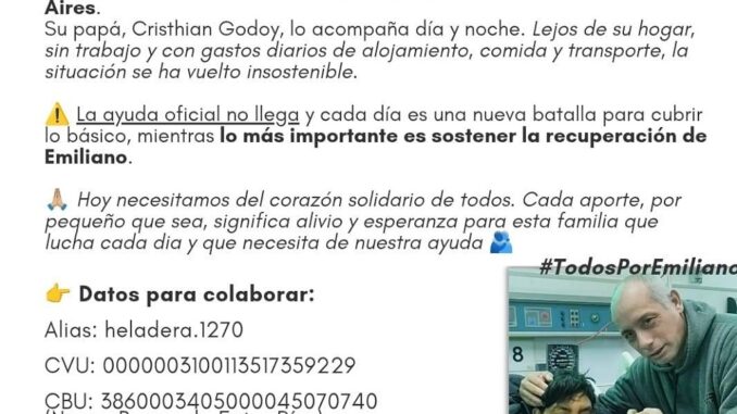 La historia de este padre conmueve y duele. Lejos de su hogar, en Buenos Aires, acompaña a su hijo internado mientras enfrenta una difícil situación económica y personal. Sin trabajo y con gastos que se multiplican, apela al corazón solidario de todos para poder cubrir las necesidades básicas durante este duro momento.