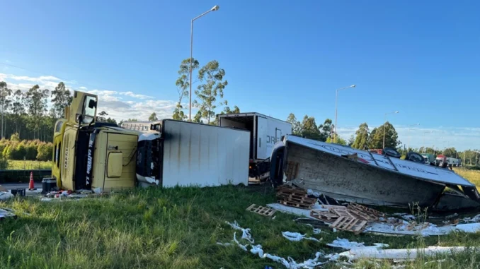 Allí, un camión marca Iveco 440, perteneciente a la firma “El Casereño S.A.”, terminó volcado sobre la cinta asfáltica mientras transportaba cajones de pollo congelado. El rodado quedó atravesado en el carril rápido del sentido ascendente, obligando a regular la circulación en una sola mano.