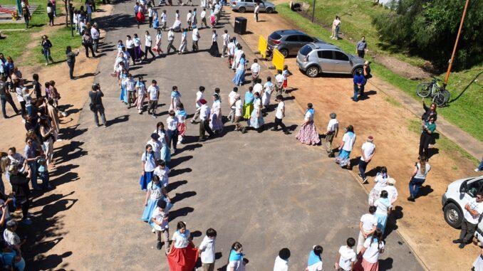 La propuesta que organizamos desde el Gobierno de Chajarí, a través de nuestra Dirección de Cultura, reunió a más de 500 estudiantes de escuelas primarias y secundarias de toda la ciudad, quienes bailaron al ritmo del Pericón Nacional.
