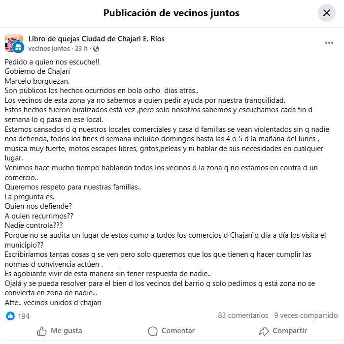Tras reiterados episodios de disturbios, ruidos molestos y hechos de violencia, vecinos del sector denuncian falta de control sobre un local nocturno y piden la intervención del Gobierno de Chajarí para garantizar la convivencia y la seguridad.